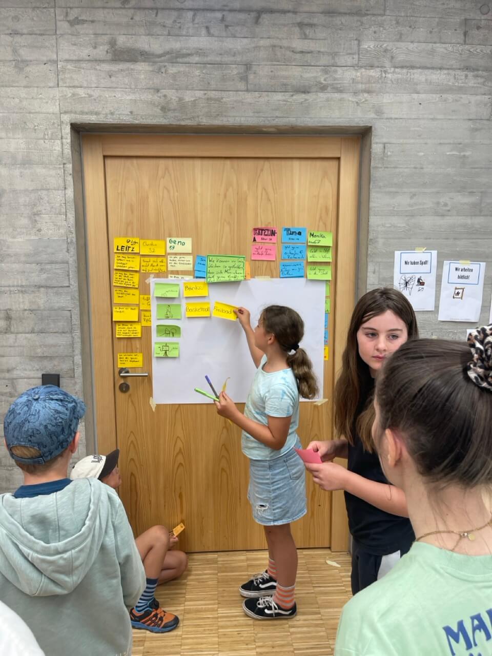 Innovationssansatz Design Thinking. Die Kinder erleben in den Workshops und Projekten eine offene Art des Denkens und Lernens. Sie arbeiten im Team, tauchen in die Aufgabenstellung tief ein, führen Interviews und erfahren so die Perspektive von anderen Menschen kennen, sie entwickeln vielfältige Ideen, bauen kreative Prototypen und testen und präsentieren diese den zukünftigen Nutzergruppen.