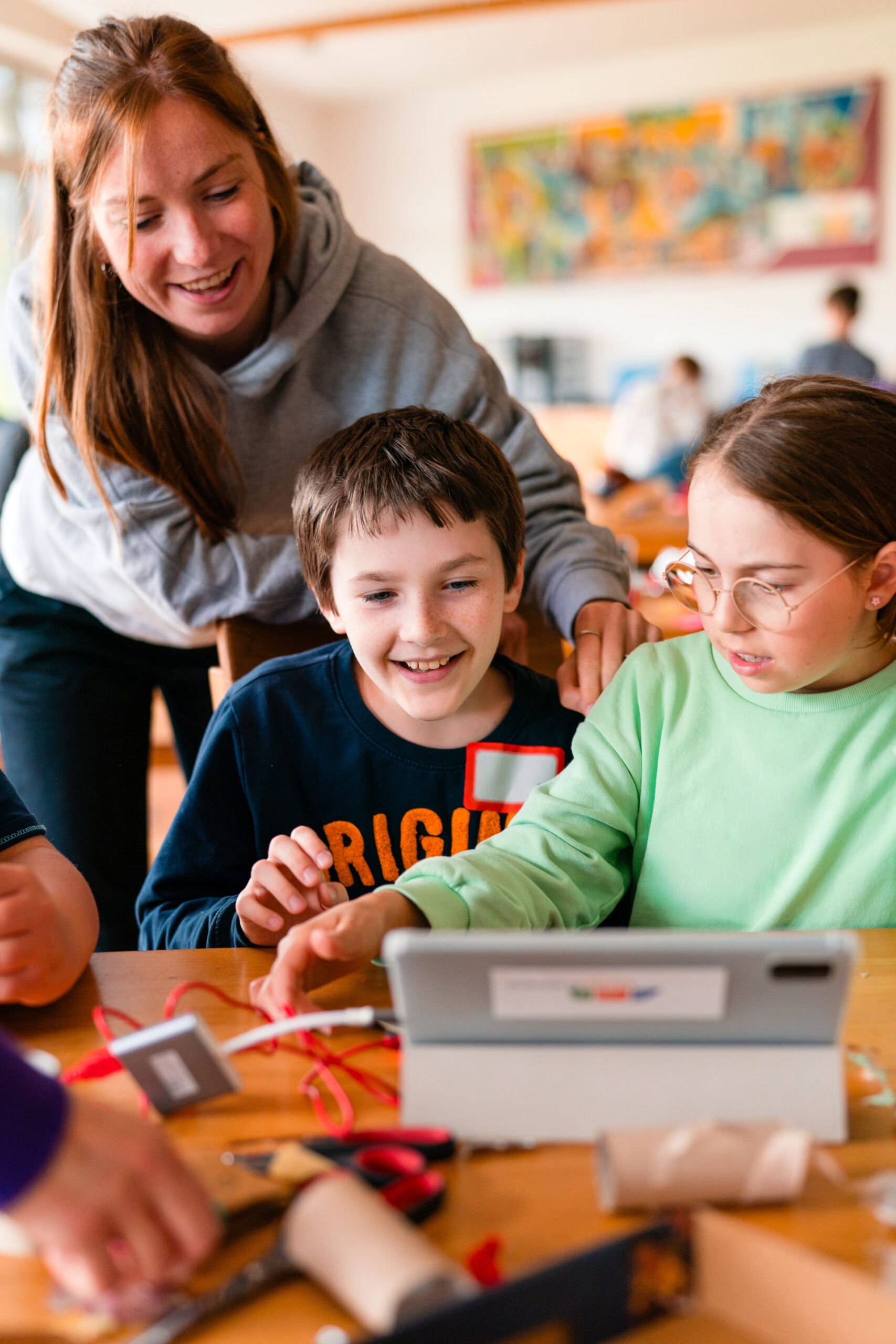 Innovationssansatz Design Thinking. Die Kinder erleben in den Workshops und Projekten eine offene Art des Denkens und Lernens. Sie arbeiten im Team, tauchen in die Aufgabenstellung tief ein, führen Interviews und erfahren so die Perspektive von anderen Menschen kennen, sie entwickeln vielfältige Ideen, bauen kreative Prototypen und testen und präsentieren diese den zukünftigen Nutzergruppen.